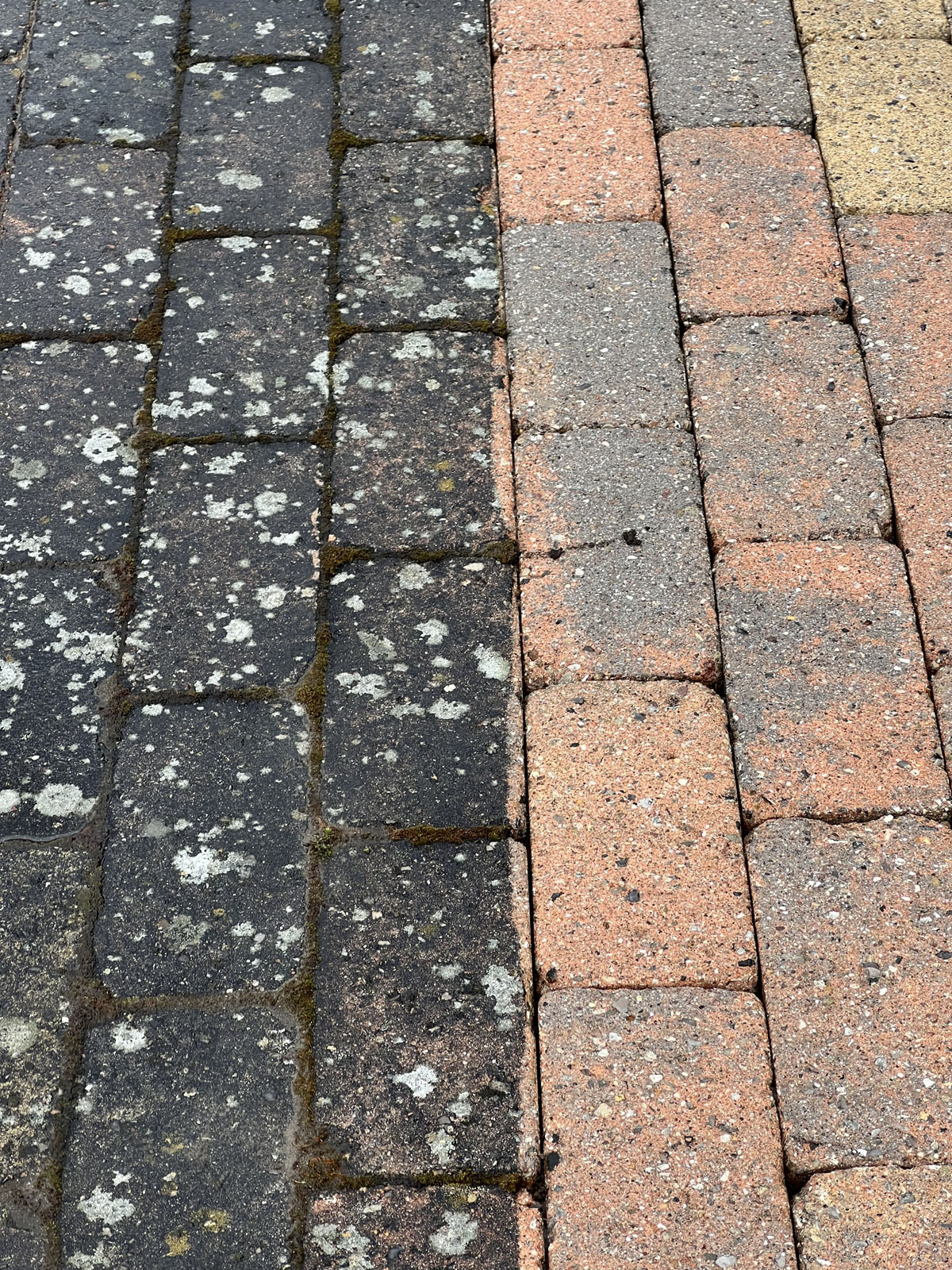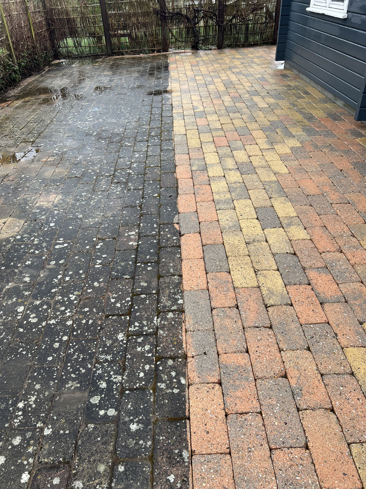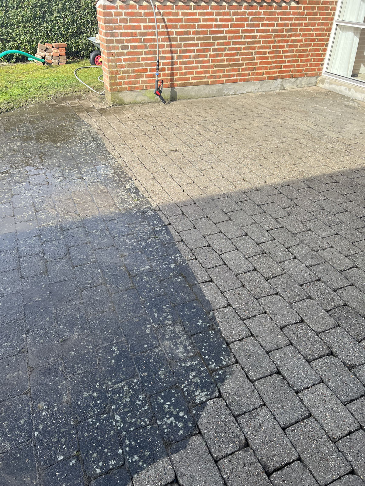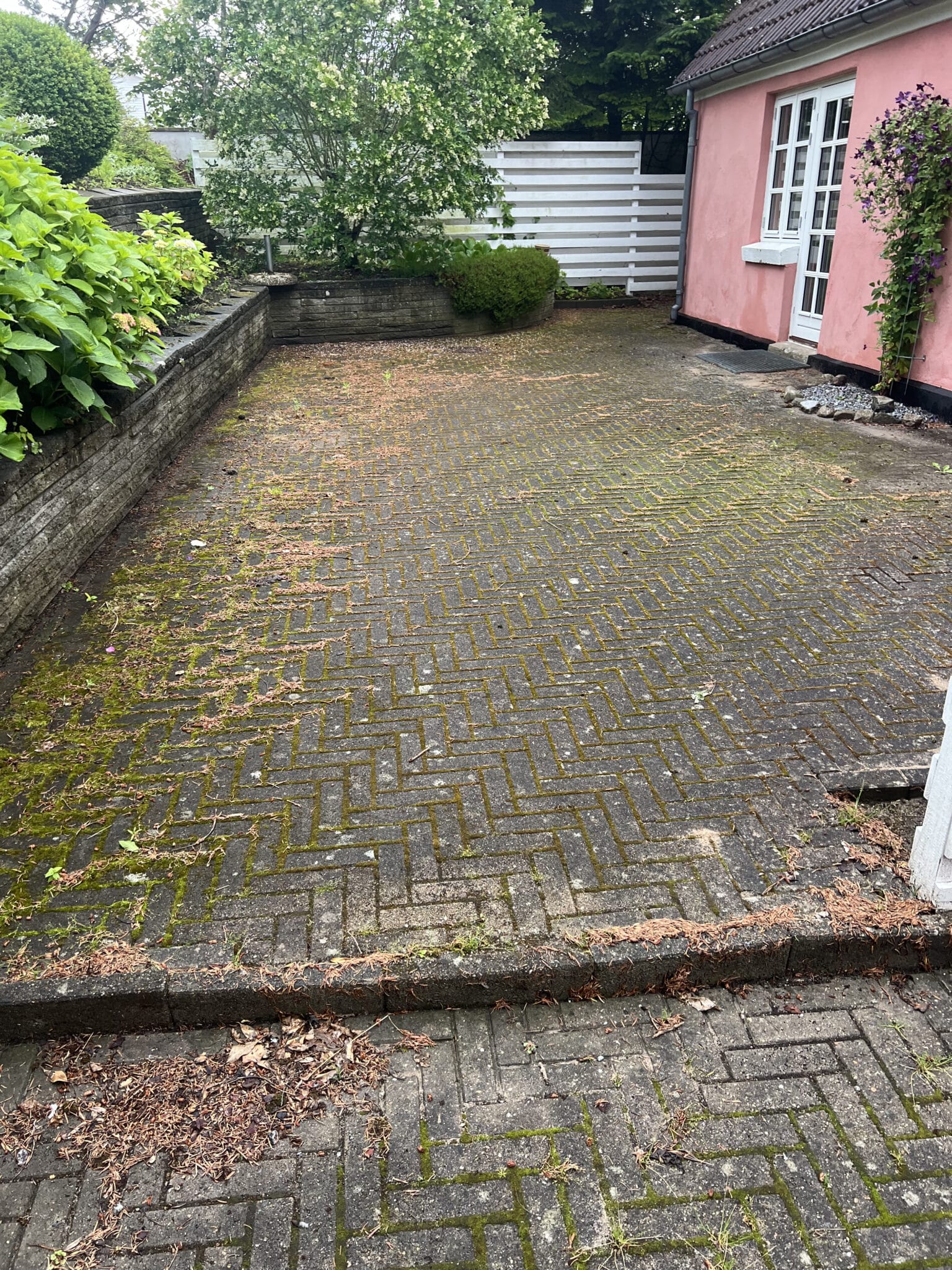 Hvis du gerne vil undgå kemi helt, kan jeg også lave hedvandsrensning med varmt vand på 80–120 grader. Det er en bæredygtig metode, der effektivt fjerner både alger og mos.
